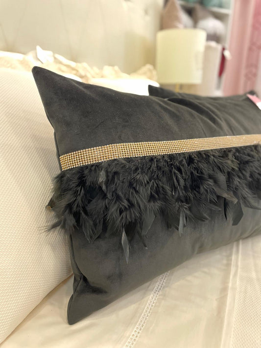 Almofada em Veludo Preto com Penas e Brilhos Dourado