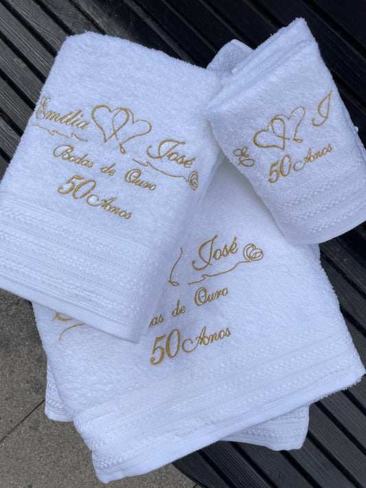 Jogo de Banho personalizado "Bodas de Prata ou de Ouro" 3 ou 6 peças - Presentes de Casamento Especiais