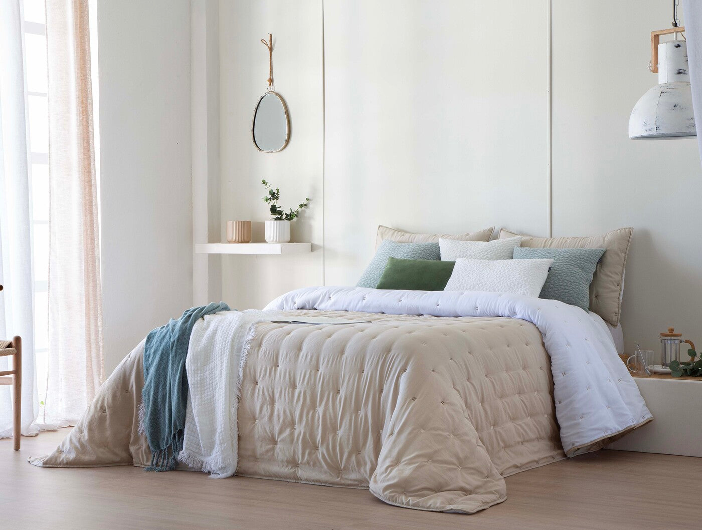 Este edredon acolchoado está disponível em duas cores elegantes e versáteis: bege e cinza.
