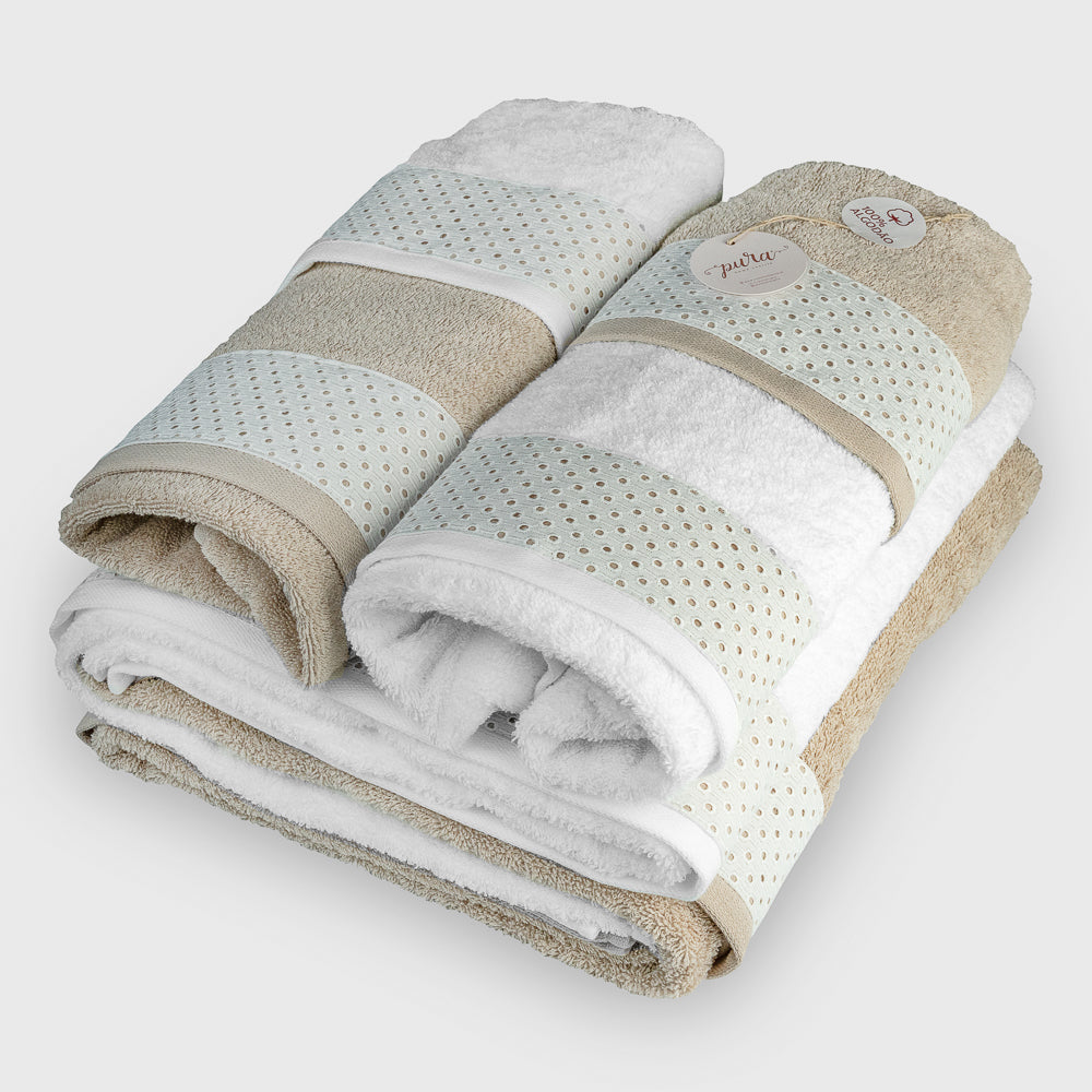 Um jogo de banho em 100% algodão, 550grs/m2, fabricado com a garantia da certificação OEKO-TEX e com um acabamento com um toque natural e suave, conservando ao máximo as propriedades naturais do Algodão, proporcionando assim um maior conforto e absorção.