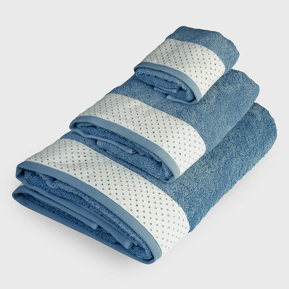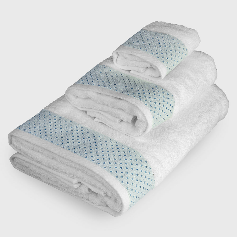 Conjunto de toalhas com renda bordado inglês e barra de cor aplicados no topo das toalhas.