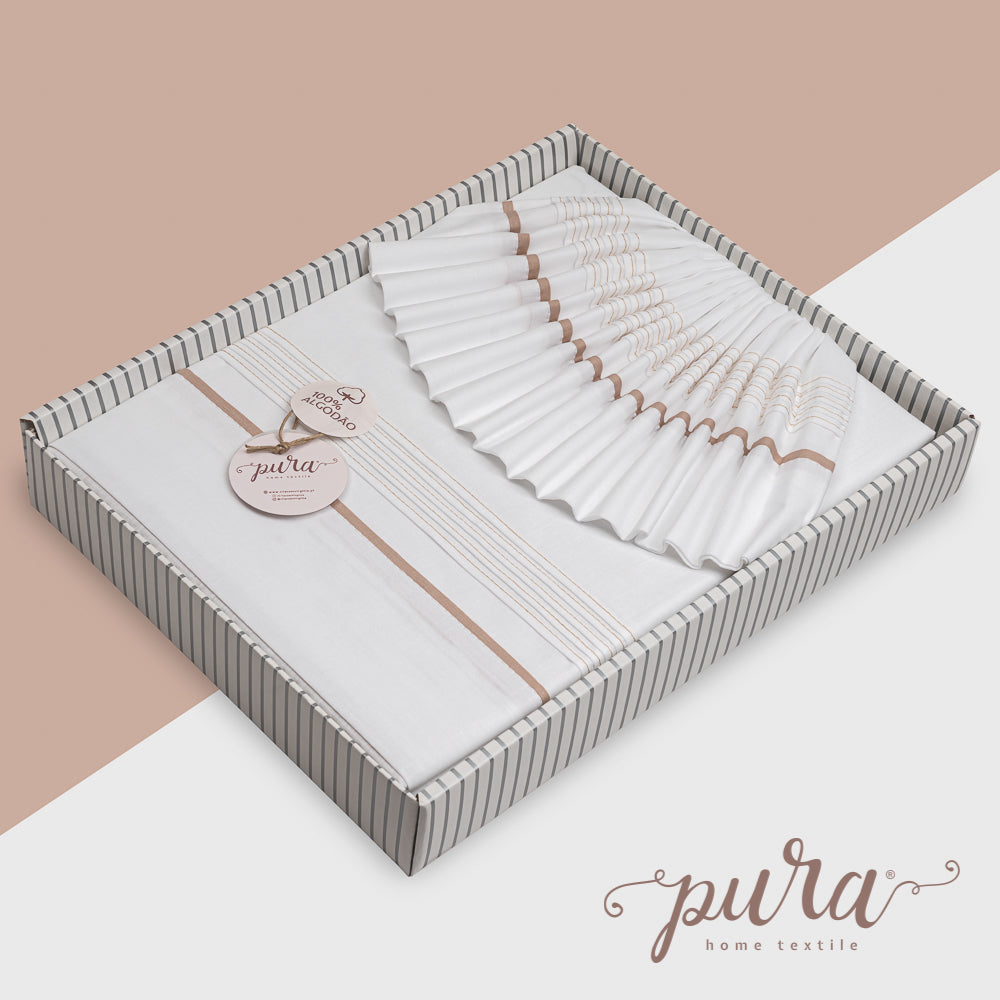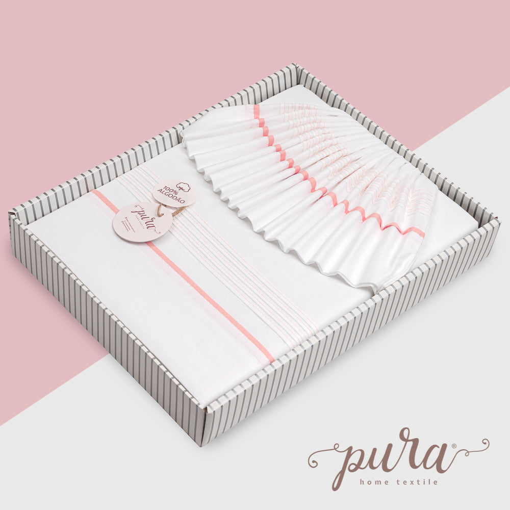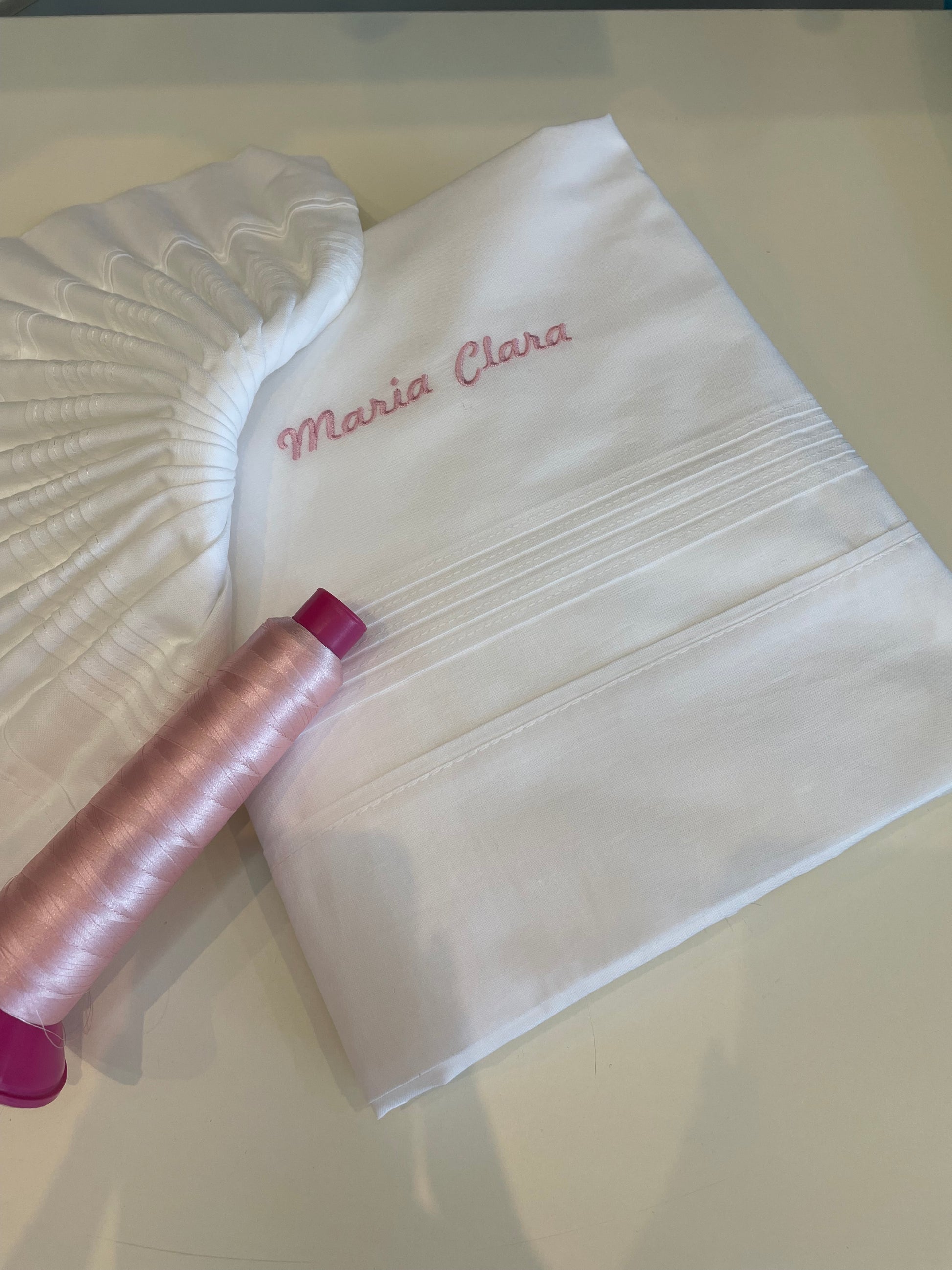 O lençol de cima e a fronha são lisos com um nervuras e vivo aplicados na ponta, a toda a largura. O lençol de baixo é ajustável ao colchão, e tem a mesma cor do vivo aplicado no lençol de cima.