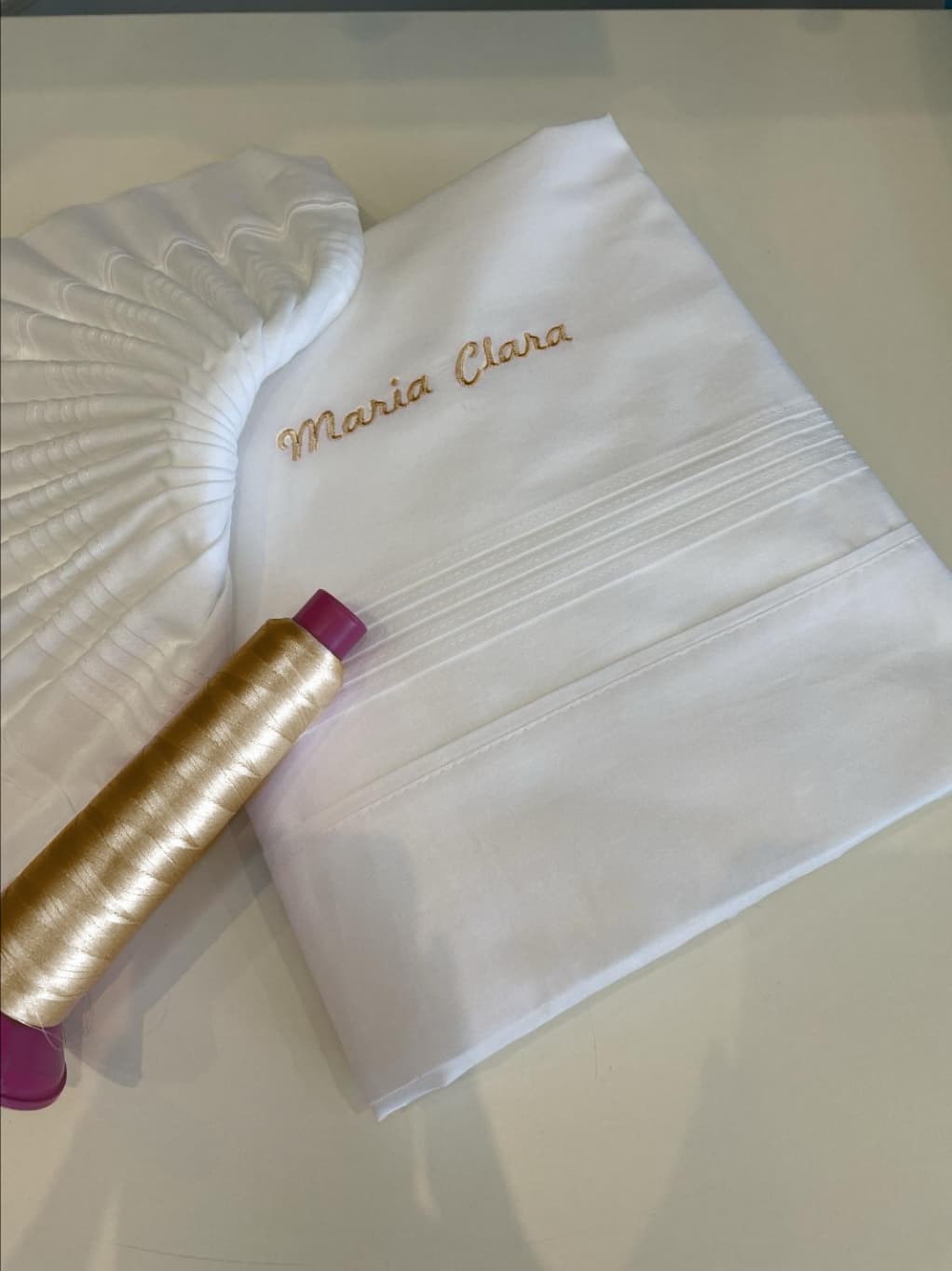 O nome vai bordado ao tom do vivo do lençol.