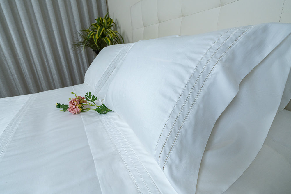 O lençol de cima e as fronhas são lisos com bordado aplicado na ponta, a toda a largura. O lençol de baixo é ajustável ao seu colchão, e tem a mesma cor do lençol de cima.