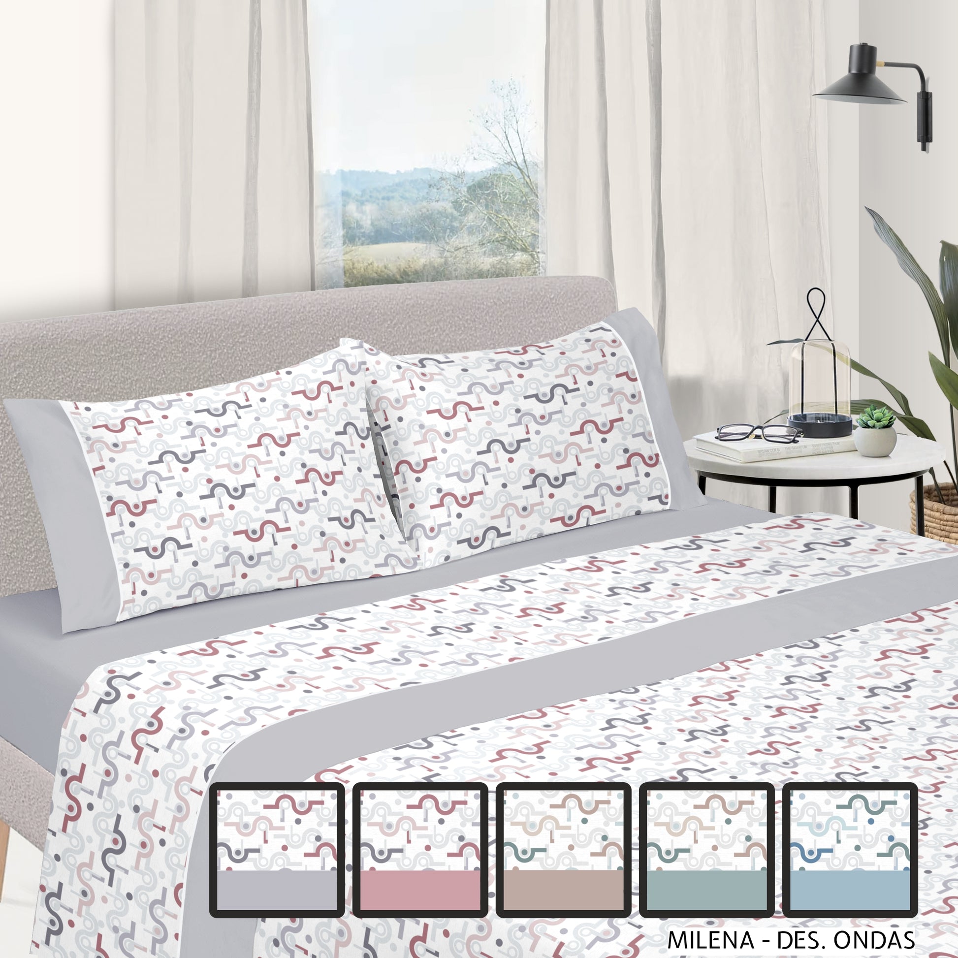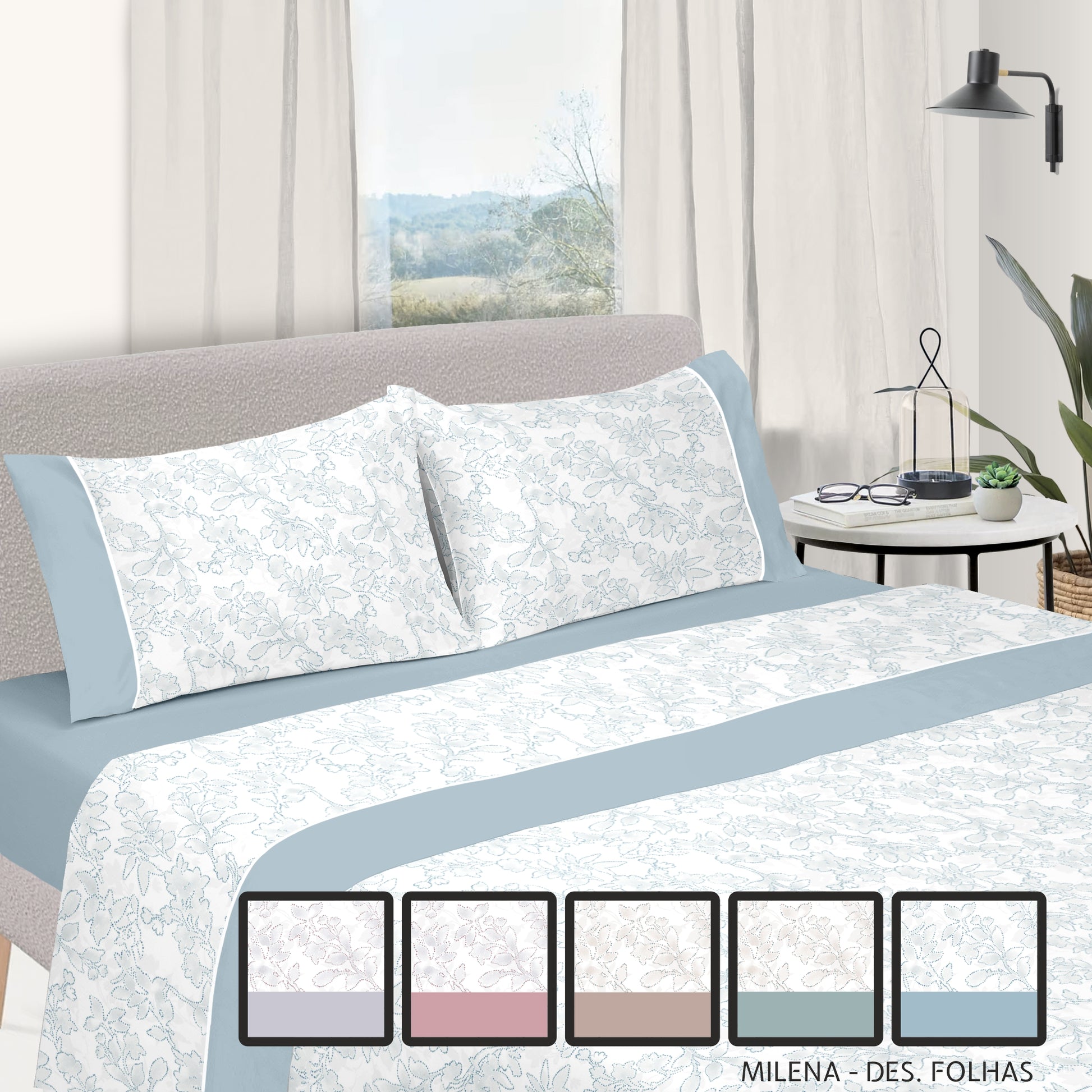 O lençol de cima e as fronhas são estampados com uma barra à cor do mesmo. O lençol de baixo é ajustável ao seu colchão, e tem a mesma cor do estampado do lençol de cima e das almofadas assim como da barra aplicada.