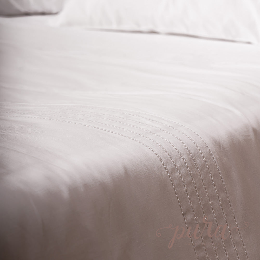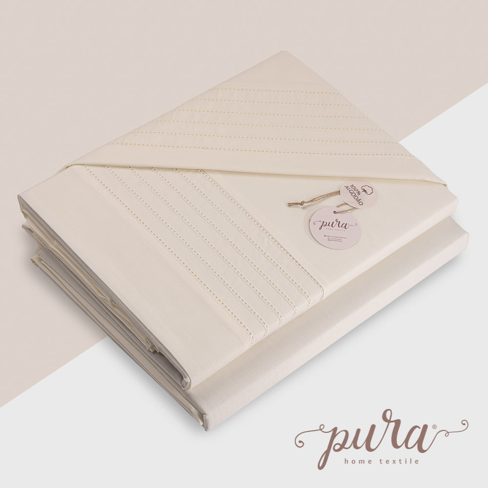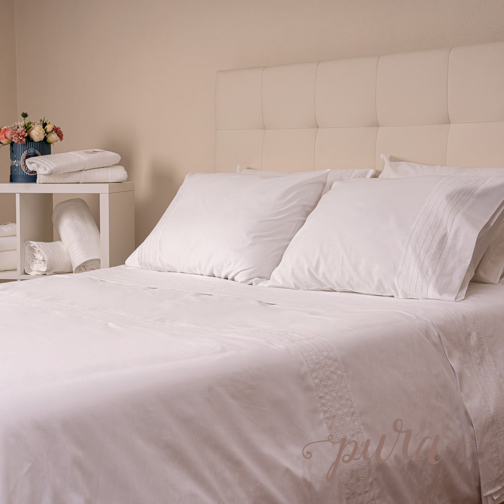 O lençol de cima e as fronhas são lisos com uma barra de bordado inglês aplicada a toda a largura que lhe transmite um toque de requinte, o lençol de baixo é ajustável ao seu colchão, com a mesma cor do lençol de cima.