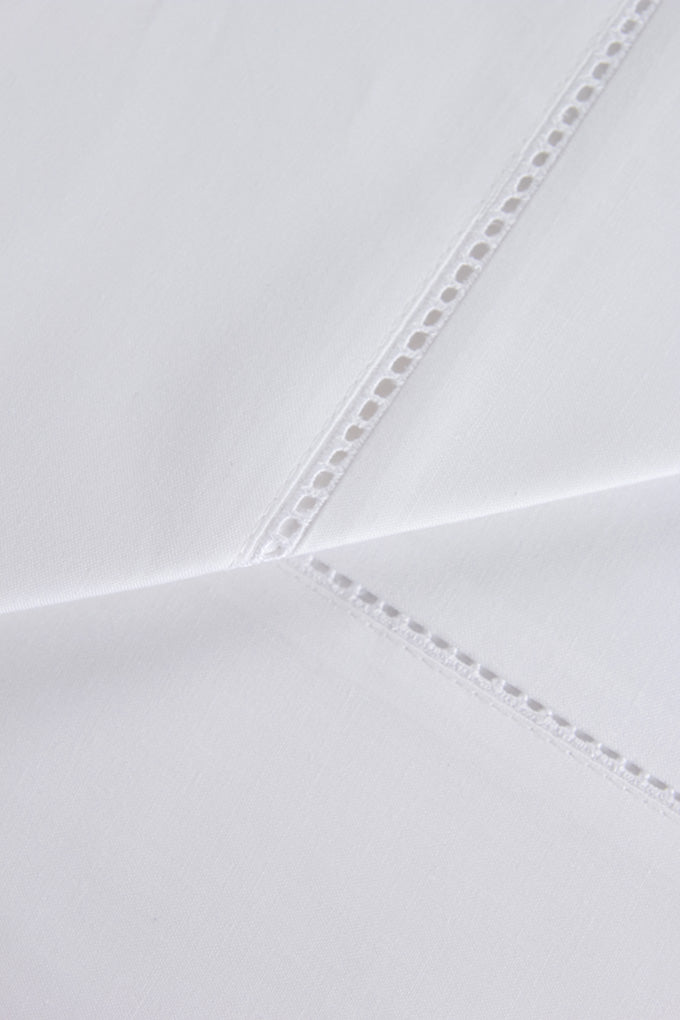 O lençol de cima e as fronhas são lisos com uma renda aplicada e uma barra de cor aplicados na ponta, a toda a largura. O lençol de baixo é ajustável ao seu colchão, com 30cm de altura, e tem a mesma cor da barra aplicada no lençol de cima.
