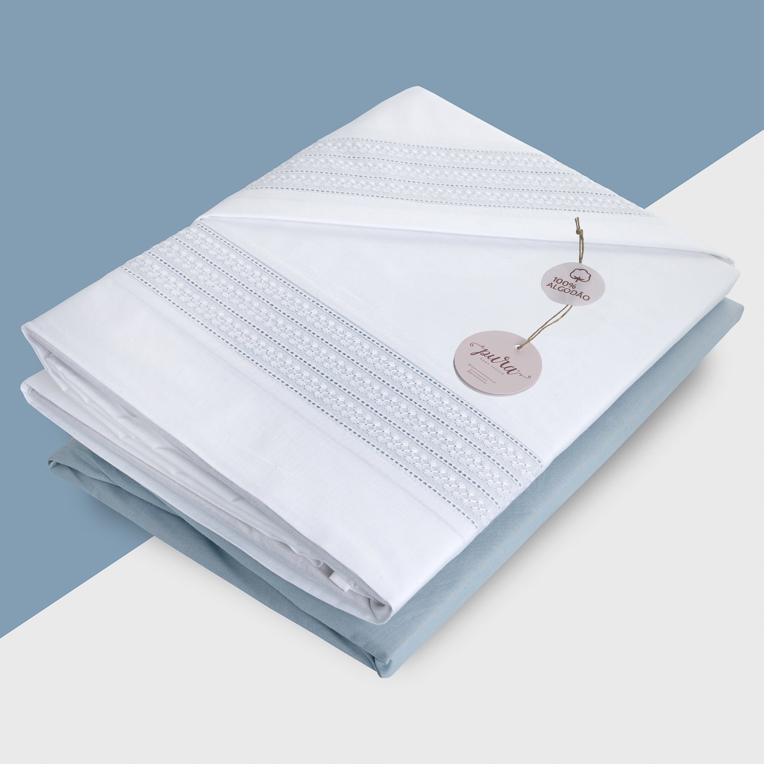 Jogo de cama em 100% algodão, 144 fios/m2, fabricado com a garantia da certificação OEKO-TEX e com um acabamento em reativos que confere aos lençóis um toque natural e suave, conservando ao máximo as propriedades do Algodão, proporcionando assim um maior conforto para que tenha um descansado saudável e um sono reparador.