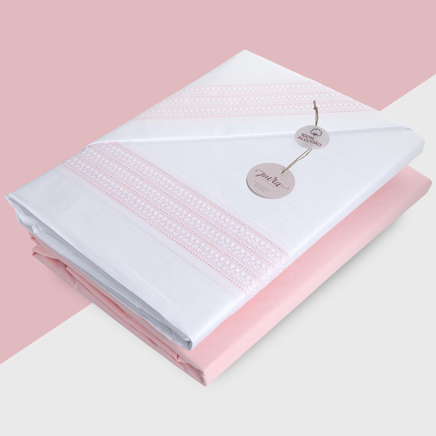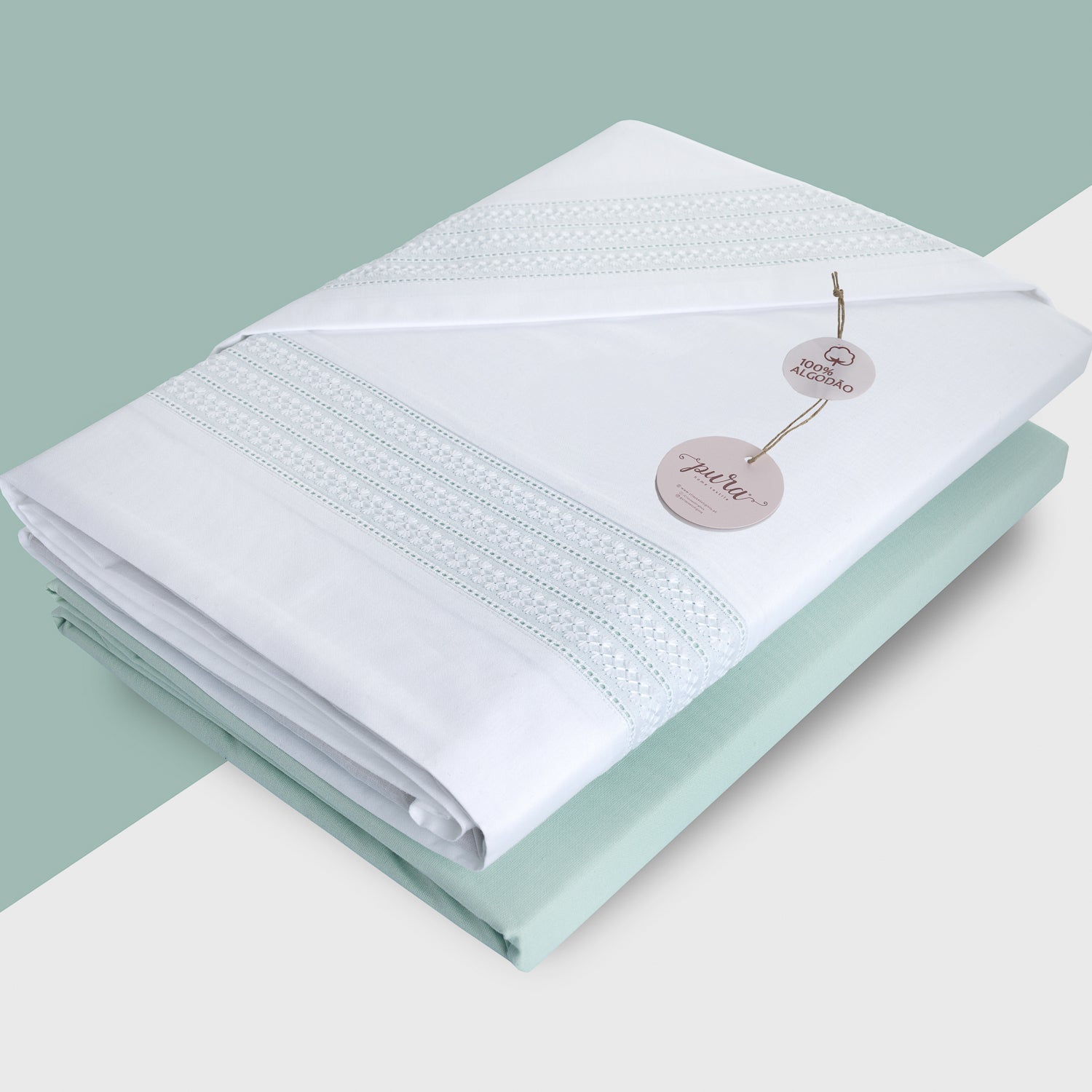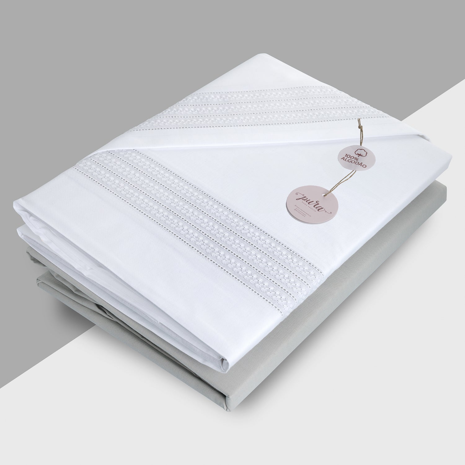 O lençol de cima e as fronhas são lisos com um entremeio em cor igual à cor do tecido do lençol de baixo que é ajustável ao seu colchão.